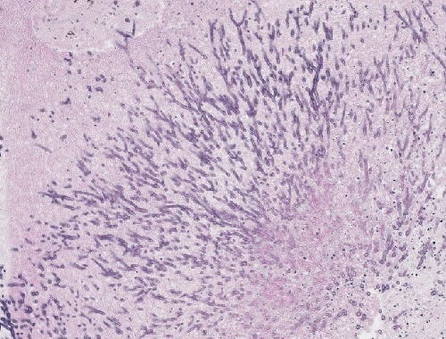 Abb. 470: Myzel mit verzweigten Aspergillus-Hyphen und Nekrose