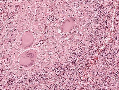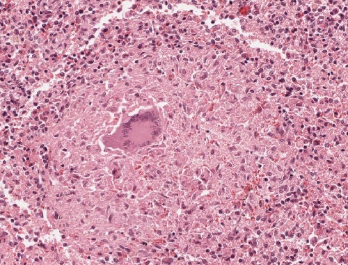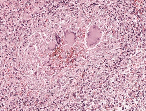 Abb. 463: Epitheloidzellgranuom in der roten Pulpa mit Nekrose