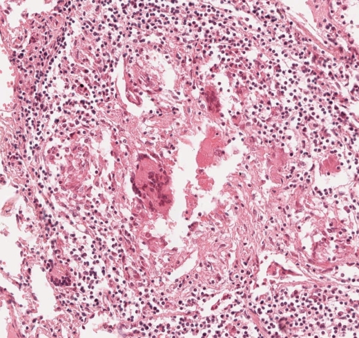 - proliferativ-produktive Entzündung mit typischen epitheloidzelligen Granulomen mit zentraler Koagulationsnekrose (Verkäsung) und mehrkernigen (Langhans’schen) Riesenzellen