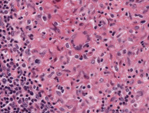 Abb. 467: Epitheloidzellgranulom (Detail) mit Riesenzelle vom Langhans-Typ
