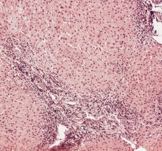 Die Virushepatitis ist eine mononukleäre Entzündung des Leberparenchyms, die durch eine unvollständige Viruselimination (mangelnde Immunantwort) chronisch werden kann.