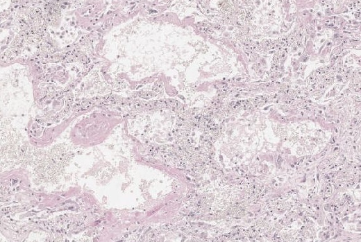 Abb. 417: Überblähung der Alveolen, hyaline Membranen, Desquamation der Alveolardeckzellen