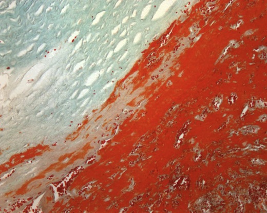 Abb. 419: Schichtung des Abscheidungsthrombus (MGG-Färbung) aus Fibrinnetzen mit Erythrozyten (rot) und weißen Blutzellen sowie Thrombozytenlamellen (hellgrün).