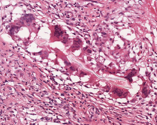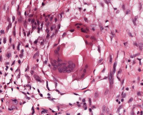 - Begleitende, chronisch-granulomatöse Entzündung mit mehrkernigen Riesenzellen vom Fremdkörpertyp sowie Lymphozyten und Makrophagen