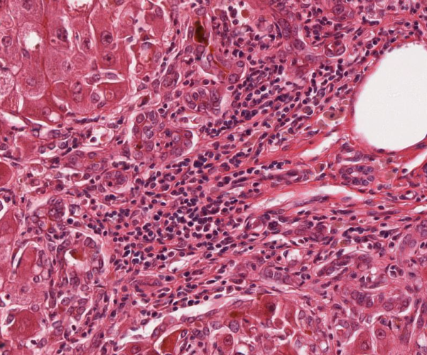 Abb. 674: Portalfeld mit Lebervene (rechte Bildhälfte) und Ausbildung dichter Gallengangsproliferate