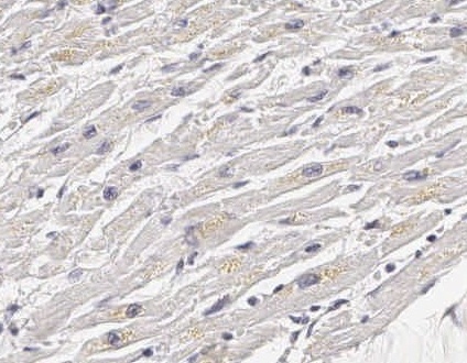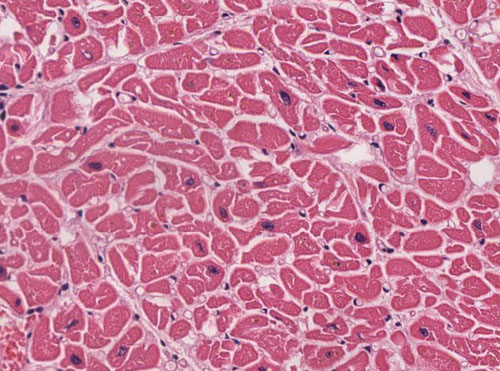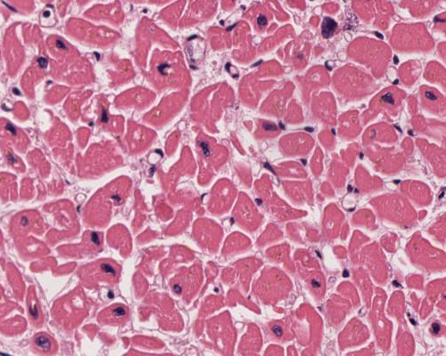 Myokard bei hoher Vergrößerung (20x) mit zahlreichen Lipofuszingranula und schmalen Kardiomyozyten.