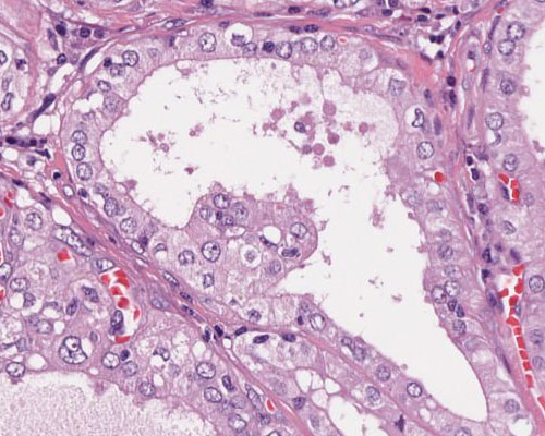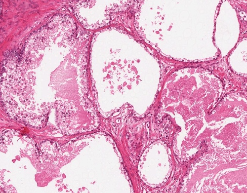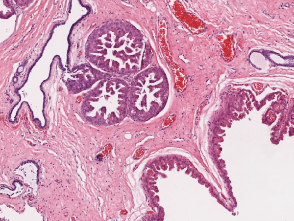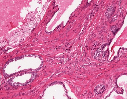 Mammagewebe mit zystischer Aufweitung der Drüsen mit abgeflachtem Drüsenepithel (links oben) und zystischer Aufweitung des Gangepithels (rechts daneben)