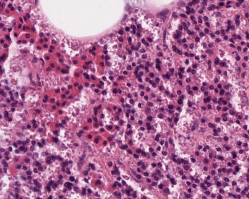 Ausschnitt mit trabekulären Zellverbänden mit dunklen Hauptzellen und oxyphilen Zellen