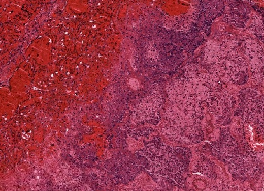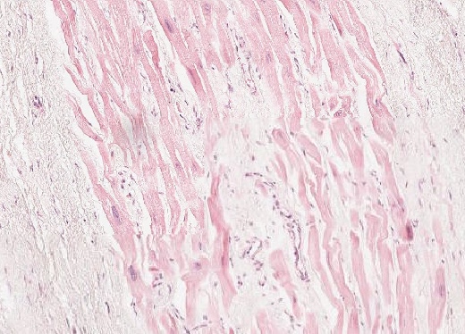 Hypereosinophilie der Kardiomyozyten, Verlust der Kernfärbbarkeit, Verlust der Querstreifung