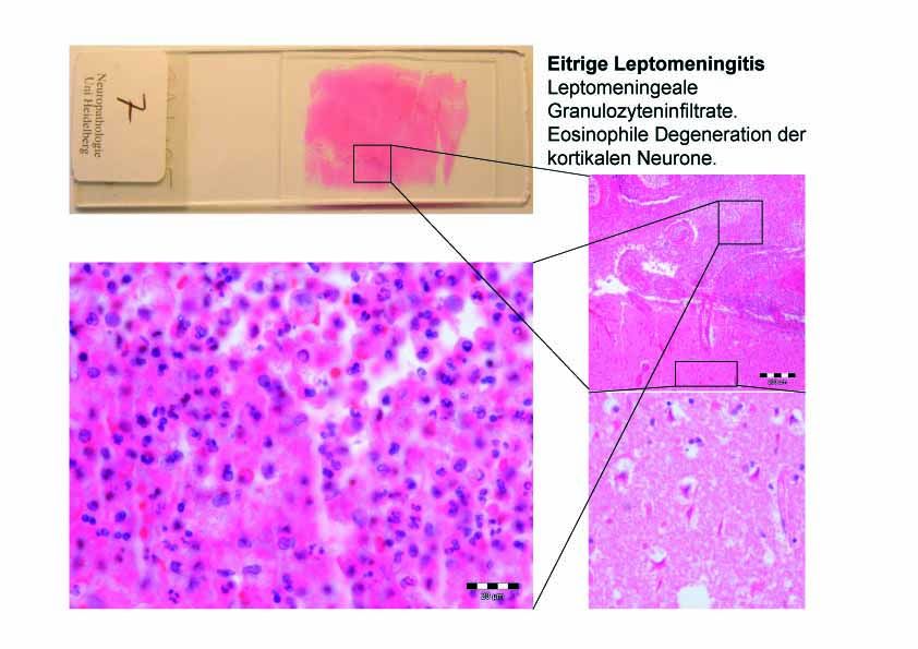 Eitrige Leptomeningitis: Leptomeningeale Granulozyteninfiltrate. Eosinophile Degeneration der kortikalen Neurone.
