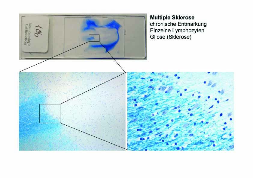 Multiple Sklerose: Chronische Entmarkung. Einzelne Lymphozyten. Gliose (Sklerose).