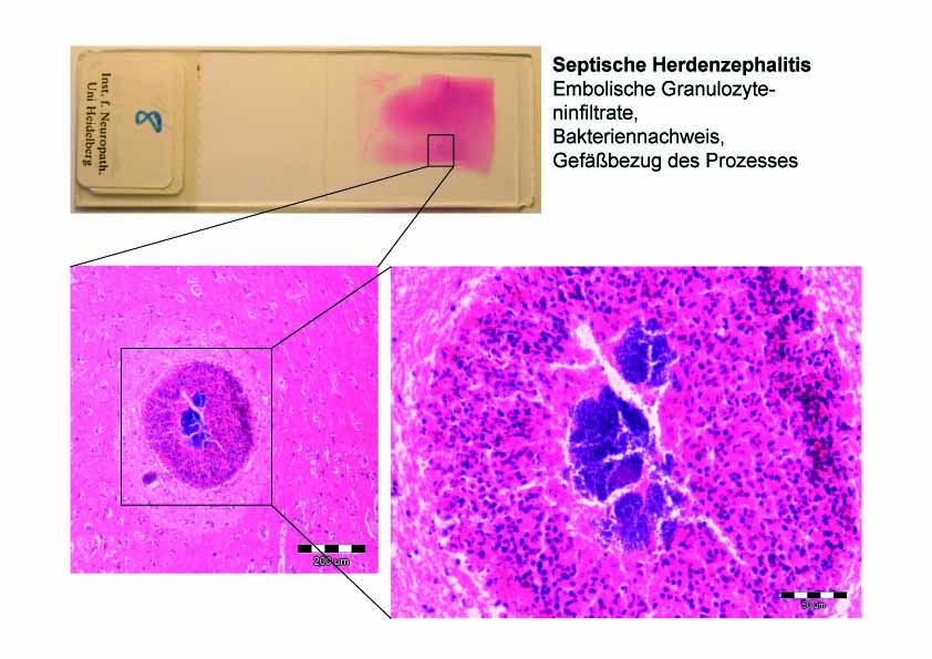 Septische Herdenzephalitis: Embolische Granulozyteninfiltrate, Bakteriennachweis, Gefäßbezug des Prozesses.