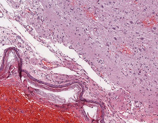 Abb. 11: Plattenepithel begrenzte Zyste mit Einblutungen der Zystenwand als Hinweis auf eine akute Zirkulationsstörung. Rechts oben reifes neurales Gewebe.