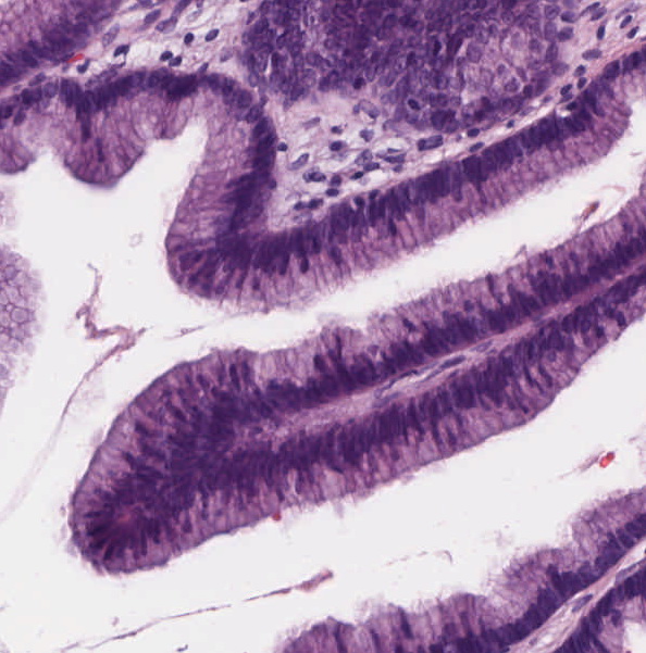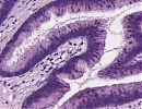 Histologisch sieht man einen zystischen, epithelialen Pankreastumor. Die mit schleimgefüllten Zysten werden durch ein hochprismatisches, schleimbildendes Epithel mit papillären Ausstülpungen ausgekleidet. Die Kerne polar angeordnet und leicht hyperchromatisch. Das die Zysten umgebende Stroma fibrös. Kein invasives Wachstum. Der Pankreashauptgang tumorfrei. Daneben kleinere Ganganschnitte mit Auskleidung durch ein reifes muzinöses Epithel. Die Resektionsränder sind tumorfrei.