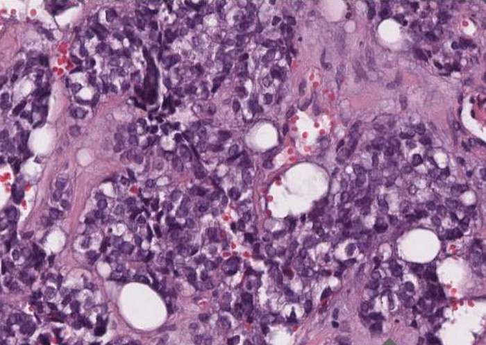 In mehreren Biopsiezylinder Infiltrate eines invasiven Karzinoms mit wenig differenzierten, überwiegend solide und angedeutet auch tubulär differenzierte Zellkomplexen und deutlicher Kernpleomorphie. Zentral eine stärkergradige Sklerose und Tumornekrosen.