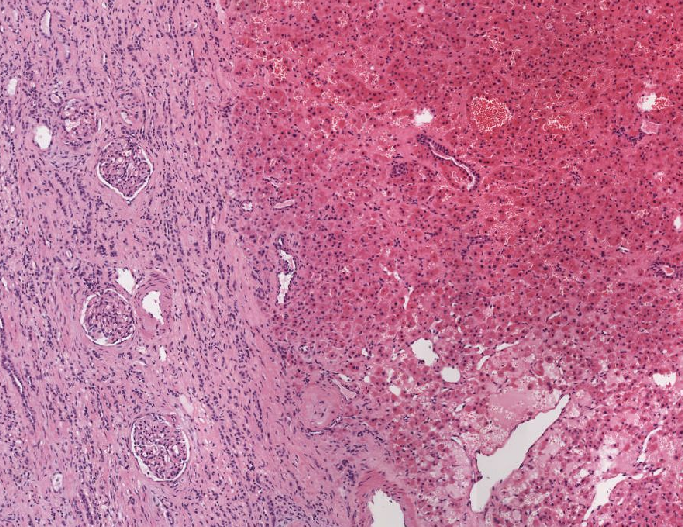 Abb. 359: Der Tumor (rechts) zeigt ein infiltratives und verdrängendes Wachstum gegenüber dem umgebenden Nierengewebe (links).