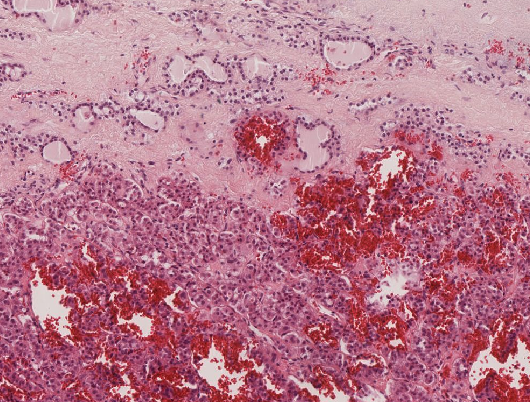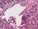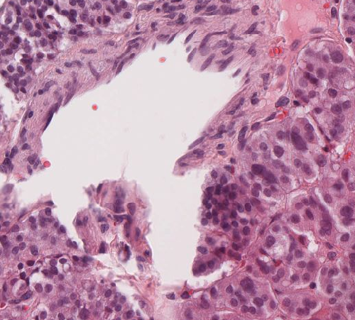 Histologisch ist eine epitheliale Neoplasie bestehend aus teils mikrofollikulären, teils soliden Zellformationen mit größenvariablen Kernen mit prominenten Nukleolen und onkozytärem Zytoplasma erkennbar. Nachweis von Gefäßeinbrüchen. Überwiegend kapselartige Begrenzung, fokal ein Kapseldurchbruch nachweisbar. Der Tumor wurde knapp im Gesunden entfernt.