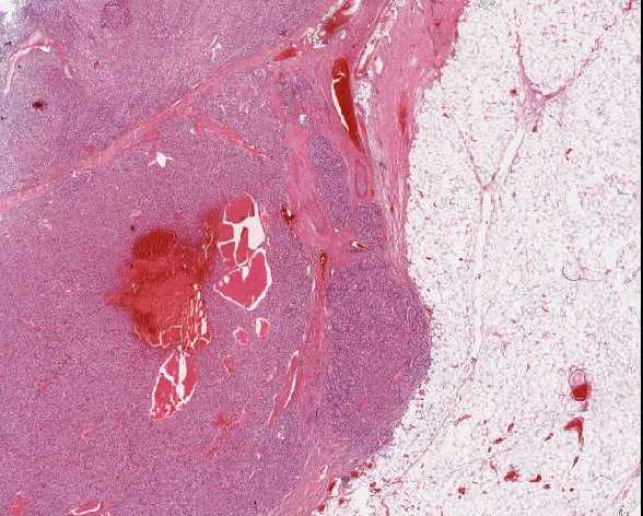 Nephrektomiepräparat (links) mit einem klarzelligen Nierezellkarzinom (G2) mit Tumorinfiltration der Nierenkapsel sowie des perirenalen Fettgewebes.