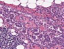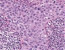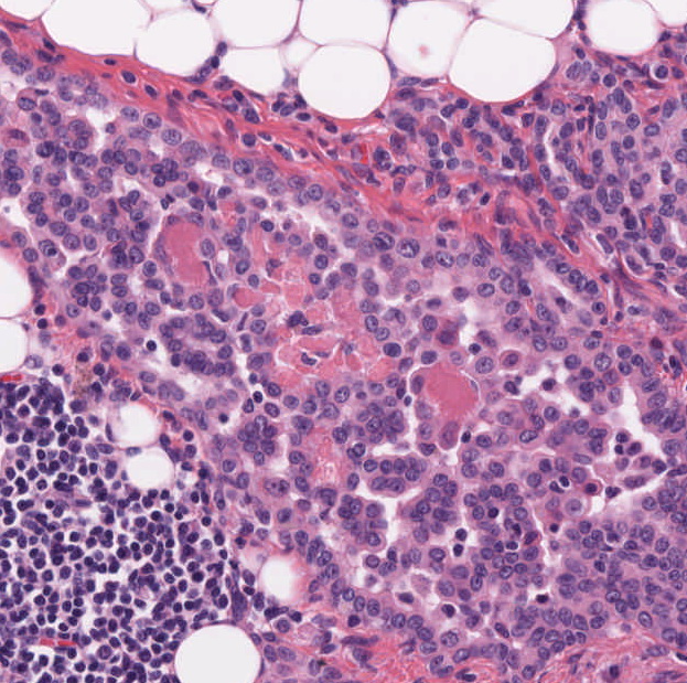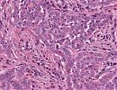 Es zeigen sich schwerpunktmässig im adventitiellen bzw. subserösen Fettgewebe plurinodöse Infiltrate eines invasiven epitheloiden Tumors mit teils solidem, teils tubulärem Wachstum. Immer wieder Nachweis von papillären Proliferaten. Die unterschiedlich großen polygonalen Tumorzellen mit recht breitem eosinophilen Zytoplasma weisen mässig pleomorphe, teils gekerbte Kerne mit locker verteiltem Chromatin und häufig kleinen Nukleolen auf. Immer wieder finden sich eosinophile Kerneinschlüsse. Die Tumorformationen infiltrieren die muskuläre Darmwand zum Teil transmural und brechen ins Colonlumen ein. Es finden sich diffuse tumöse Infiltrate in und um die Appendix und dem großen Netz. Außerdem Nachweis von Tumorausläufer im Colon- und Ileumabsetzungsrand. Immunhistologisch zeigen die epitheloiden Tumorzellen eine Koexpression von Panzytokeratin (KL-1) und Calretinin. Die Proliferationsrate (ki67) integral ca. 10%.