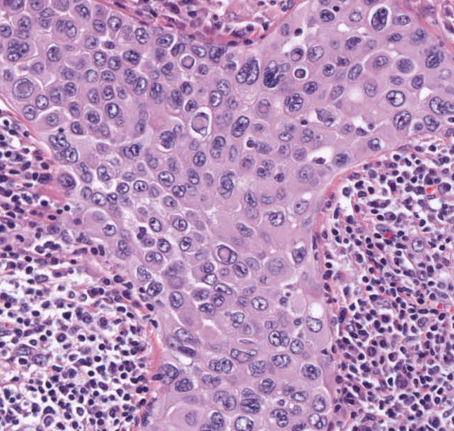 Histologisch zeigte sich im Resektat des oberen Zwerchfells und Biopsaten aus der Leberkapsel weiter Manifestationen des malignen Mesotheliom. Zwei mitresezierte Lymphknoten wiesen einen lymphogene Metastasierung auf.