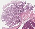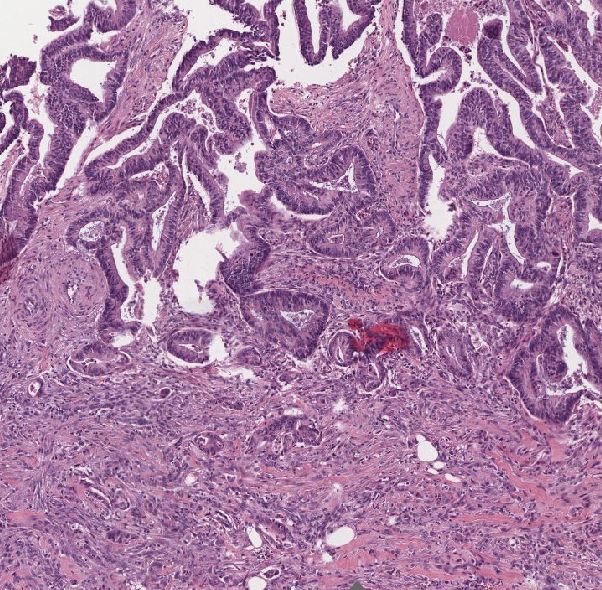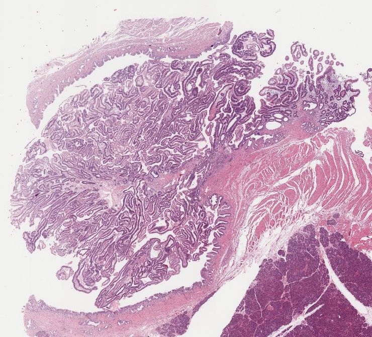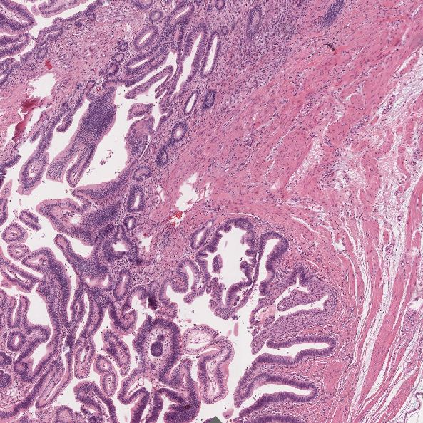 Querschnitte durch die polypöse Läsion der Papille zeigen eine adenomatöse Neubildung mit tubulären Differenzierungsmustern. Diese oberflächlich begrenzt durch ein mehrreihiges Zylinderepithel mit mäßiggradigen Atypien. Fokal ein invasives Tumorwachstum mit Infiltration der Muscularis mucosae und übergreifen des Tumors auf die Submukosa. Pankreas, Gallengang, distale und proximale Absetzungsränder tumorfrei.