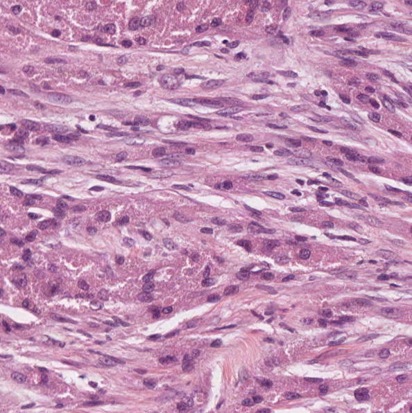 Erkennbar ist ein intradermal gelegener und unscharfer abgegrenzter tumoröser Prozess mit einem überwiegend in Faszikeln gelagerten, angedeutet spindelzelligen Tumor. Sie enthalten isomorphe Zellkerne und ein granulär-eosinophiles Zytoplasma. Die Zellverbände reichen in filiformen Ausläufern in den tiefen bzw. seitlichen Präparaterand. Die Haut auf Schnittrandniveau ist tumorzellfei. Hinweise für eine maligne Entartung waren nicht nachzuweisen.