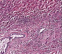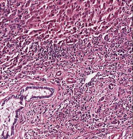 Neben regelrecht strukturiertem atrophem Leberparenchym sieht man Areale mit deutlich gestörter Architektur. Auffällig sind breite kollagenfaserreiche Areale mit einer teilweise sklerosierenden, lymphoplasmazellulär geprägten Entzündungsreaktion, die konzentrisch um Gallengangsstrukturen mit häufig periduktalem Ödem organisiert ist. Gelegentlich auch entzündliche Infiltrate im Gallengangsepithel. In der Peripherie erkennt man entzündlich infiltrierte Nervenfaseranschnitte, fokal auch eine lymphozytäre Arteritis. Immer wieder fallen prominente Lymphfollikel ins Auge. Granulome finden sich nicht; der Prozess ist gegen das Leberparenchym gut abgrenzbar.