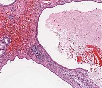 Der gestielte Schleimhautolyp zeigt inmitten eines entzündlich aufgelockerten Stromas zystisch erweiterte Drüsen, die von einem Epithel ortsüblicher Zellen mit Lamina propria ausgekleidet werden. Im Stroma gefäßreiches Granulationsgewebe mit zahlreichen weitlumigen dünnwandigen Blutgefäßen und großen mononukleären Histiozyten sowie Lymphozyten und wenige Plasmazellen.
