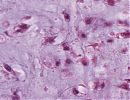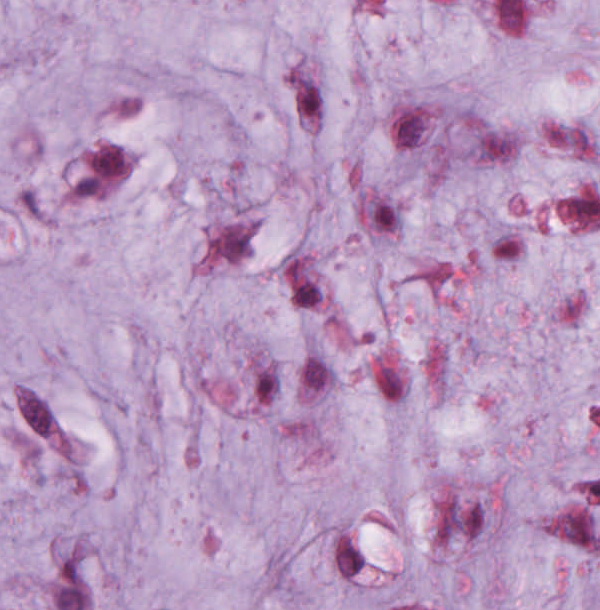 Die erkennbare chondroide Neoplasie ist knotig lobuliert aufgebaut, und enthält eine überwiegend basophil-hyaline, gering bis mäßig myxoid aufgelockerter Grundsubstanz mit unterschiedlicher Zelldichte. Die Zellen bestehen aus ein-, gelegentlich binukleär gestalteten chondroiden fokal deutlich eosinophilen Zellelementen. Weiterhin zeigt sich eine ausgeprägte Nekrotisierung und eine Infiltration von knöchernen und angrenzenden Weichgewebe. Die Tumorformationen reichen bis in den knöchernen Präparaterand.