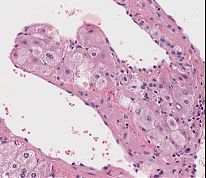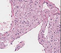 Histologisch erkennt man eine unscharf begrenzte Läsion mit unregelmäßigen im Leberparenchym verteilten, teils in unmittelbarer Nachbarschaft zu Portalfeldstrukturen gelegenen dilatierten mit Endothel ausgekleideten vaskulären Räumen. Neben regelecht gestalteten Portalfeldern finden sich auch zahlreiche Felder mit fehlenden bzw. obliterativ veränderten Portalvenenästen. Daneben finden sich größere herdförmige Fibroseareale, meist ebenfalls mit dilatierten Gefäßstrukturen und Gallengangästen. Immunhistologisch bestätigt sich nach Anfärbung von Gefäßendothelien (CD31, CD34) die Abwesenheit von Portalvenenästen in einem Teil der Portalfelder. Daneben kommt eine herdförmig akzentuierte Kapillarisierung der Lebersinusoide zur Darstellung. In der Zytokeratin 7-Immunhistochemie erkennt man chronische Cholestasezeichen in Form von Gallengangsproliferaten sowie herdförmiger duktulärer Metaplasie von Hepatozyten.