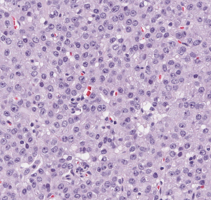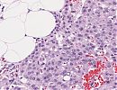 Erkennbar ist ein mehrknotiger endokriner Tumor mit fokal akzentuierter Stromasklerose. Die Zellen enthalten runde Kerne, deutliche Nukleoli, mäßig viel Zytoplasma und bilden Nester und Stränge. Der Tumor reicht bis in das peripankreatische Fettgewebe hinein und teilweise an den Präparaterand heran. Ein Blutgefäßeinbruch ist nicht nachweisbar. Die Mitoserate beträgt 1/10 HPF. Der Tumor reicht bis unmittelbar an den Präparaterand.
