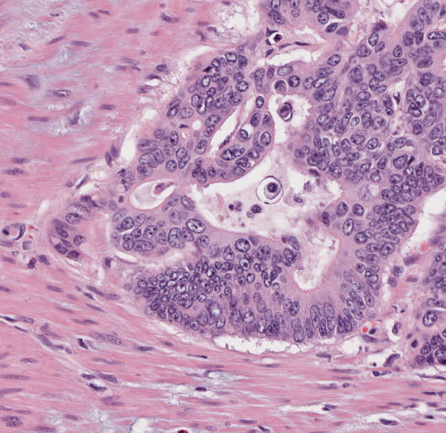 PE: Histologisch finden sich Anteile eines ulzerierten, mittelgradig differenzierten Adenokarzinoms (G2).