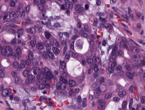 Abb. 170: Barrett-Karzinom des Ösophagus. Erkennbar sind glanduläre Tumorformationen, die Tumorzellen mit verschobener Kern-Plasmarelation und hyperchromatischen Kernen mit z.T. deutlich erkennbaren Nukleoli.