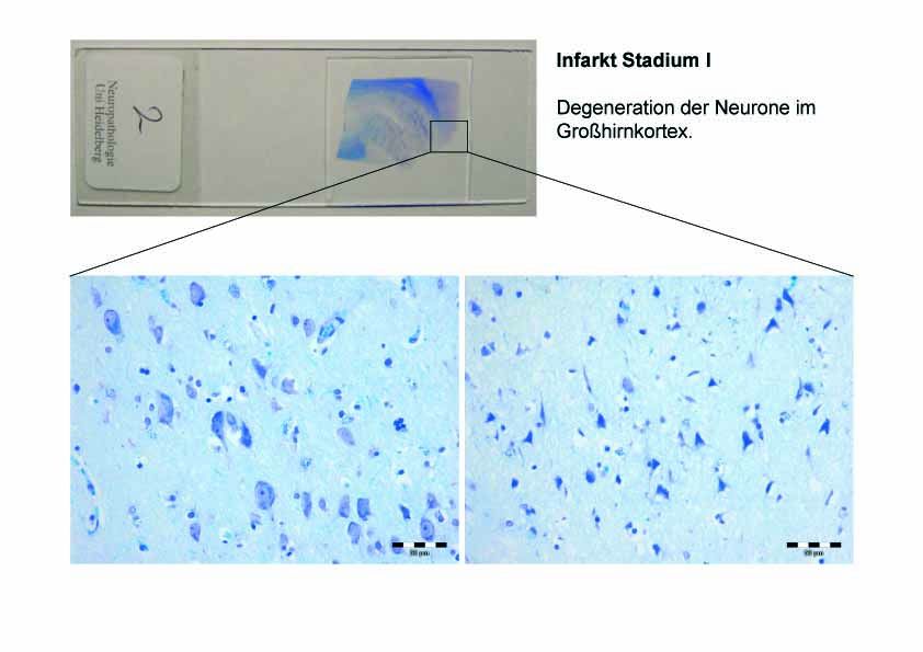 Abb. 37: Infarkt Stadium I. Degeneration der Neurone im Großhirnkortex.
