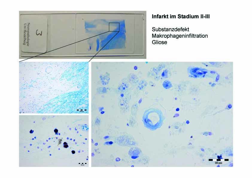 Histopathologisch lassen sich Infarkte den Stadien I, II und III zuordnen. Das Stadium I ist gekennzeichnet durch den Untergang von Nervenzellen mit Chromatolyse und eosinophiler Degeneration sowie durch eine ödematöse Auflockerung des infarzierten Gewebes. In Abhängigkeit der Ausdehnung des Infarkts kann das Stadium I bis zu einigen Tagen andauern. Das Stadium II zeichnet sich durch eine dichte Makrophageninfiltration mit Abräumung des infarzierten Gewebes sowie durch eine Neueinsprossung von Gefäßen aus. Das Stadium II beginnt mit dem zweiten Tag und kann in Abhängigkeit der Ausdehnung des Infarkts bis zu einigen Wochen andauern. Das Stadium III entspricht dem Endzustand. Typisch ist ein Substanzdefekt und eine Glianarbe.