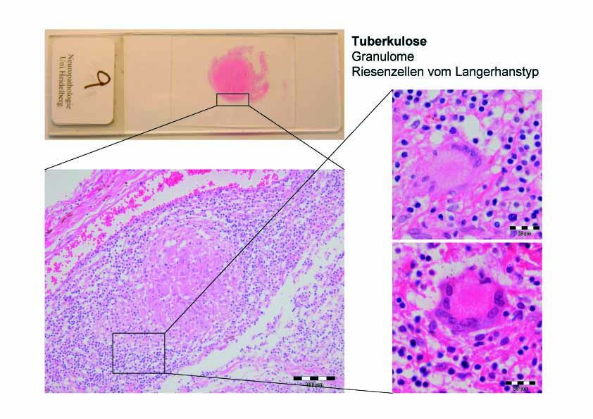 Die entzündlichen Veränderungen betreffen vorwiegend die basalen Zisternen unter Einschluss der Sehnerven, der Infundibularregion, der Hirnschenkel und der Brücke. Mikroskopisch finden sich verkäsende Granulome mit dichtliegenden Epitheloidzellen, Langhans-Riesenzellen (v.a. an den Nekroserändern) und entzündlichen Infiltraten (Lymphozyten, neutrophile Granulozyten). Die Gefäße können in Form einer Arteriitis und einer Thrombophlebitis mitbeteiligt sein. Tuberkulome können sich ebenfalls aus verkäsenden Granulomen bilden. Zentral bestehen diese aus einer Verkäsung, die von Epitheloidzellen und einem entzündlichen Infiltrat (in geringerem Ausmaß als bei der Meningitis) ungeben sind. Weiterhin kann es zu einer ausgeprägten Bindegewebskapselbildung mit Kapillarproliferation kommen.