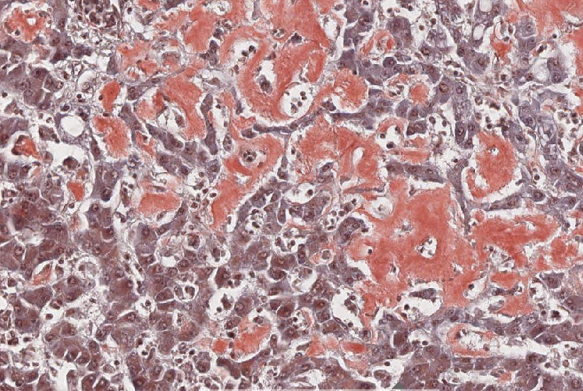 Als Amyloid bezeichnet man eine Gruppe von Proteinen und Glykoproteinen, die zu Gewebeablagerungen führen und folgende Eigenschaften besitzen: