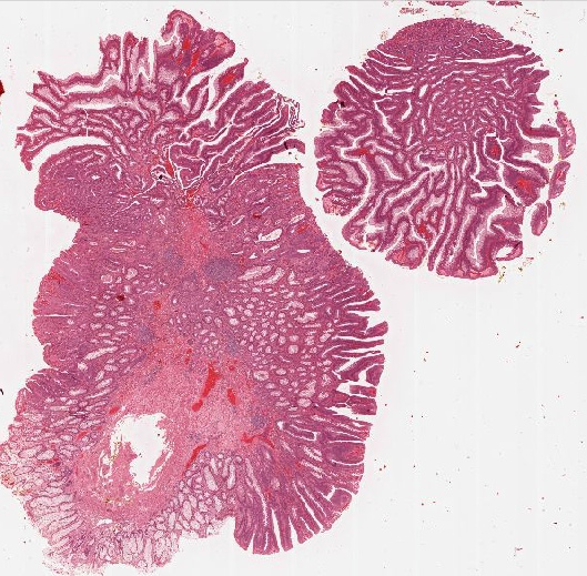 Der Begriff invasives Adenokarzinom setzt dabei voraus der Tumor bereits die Muscularis mucosae durchbrochen hat und in die Submukosa infiltriert1. Die Unterscheidung zwischen invasivem Tumorwachstum und hochgradiger Dysplasie ist wichtig, da beim invasiven Tumor bereits das biologische Potential zur Metastasierung vorliegt, was bei der Dysplasie noch nicht der Fall ist.