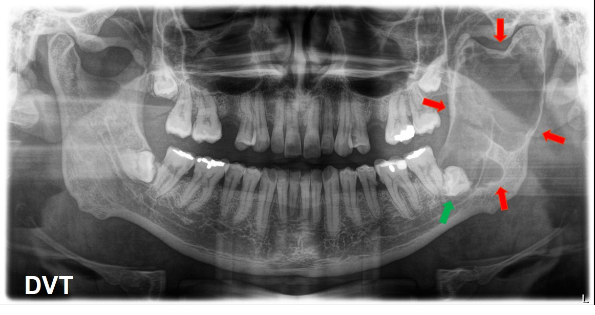 - Zystische Raumforderung im linken Kieferwinkel (rot)