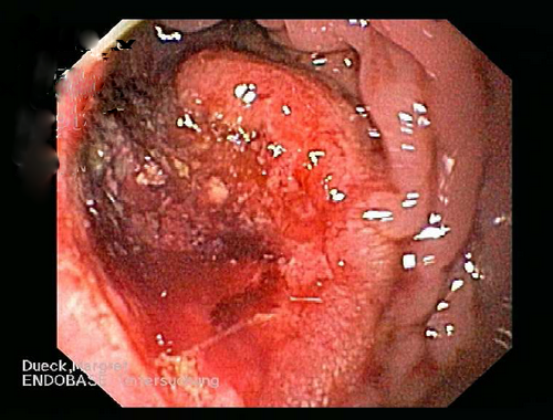 Bei 40 cm ab ano gelegene hochgradige Stenosierung, die mit dem Endoskop nicht passiert werden kann.