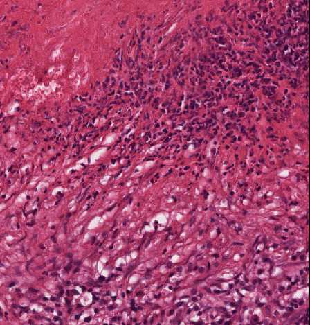 Abb. 125: Nekrose mit Zelltrümmern und granulozytärem Demarkationssaum