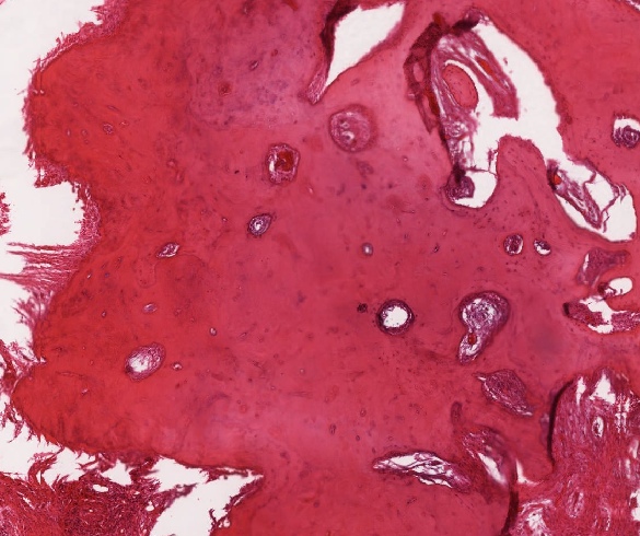 Innerhalb einer bindegewebigen Kapsel Schmelz, Dentin, Zement, z.T. auch Zahnkeime bzw. zahnähliche Strukturen; die einzelnen Bestandteile können unterschiedlich gut ausdifferenziert sein (z.B. Dentin mit typischer kanalikulärer Struktur, Schmelz mit typischen Schmelzperlen); die verschiedenen Komponenten teils in wirrer Anordnung, teils wie im normalen Zahn angeordnet